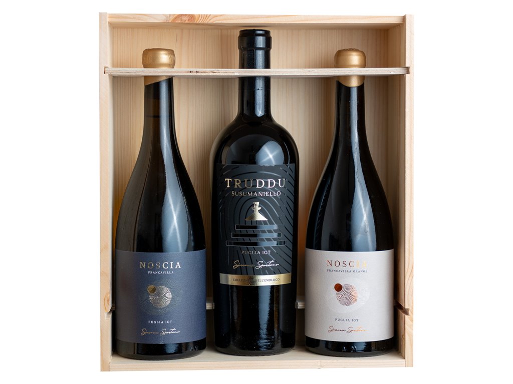 Tenhle set je postavený na zapomenuté místní odrůdě Francavilla a ikonickém Susumaniellu – přesně tak, jak je vinař Simone Santoro zamýšlí: autenticky, s minimem zásahů a maximálním charakterem.